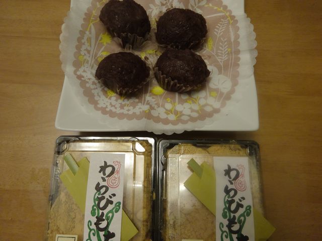 お彼岸なので、おはぎを買ってきました。ついでに一緒に売っていたわらびもちも買いました。夜ごはんの後に食べたので、お腹一杯です。