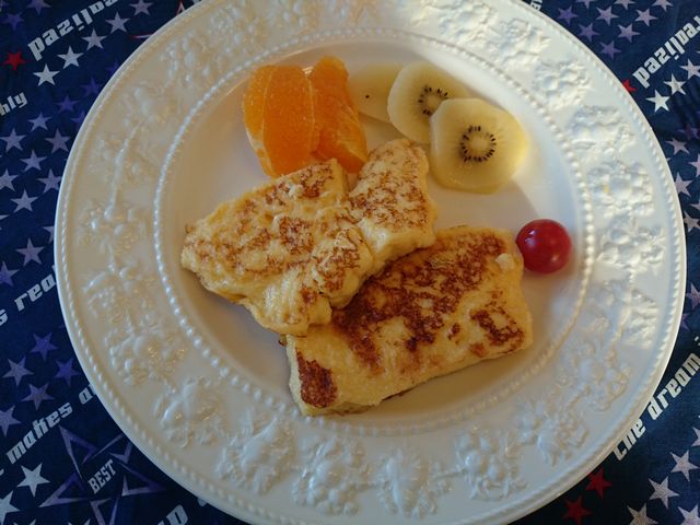 《とり》が朝からフレンチトーストを《へび》と一緒に作っていました。自分の分だけ豪華に盛り付けていました。