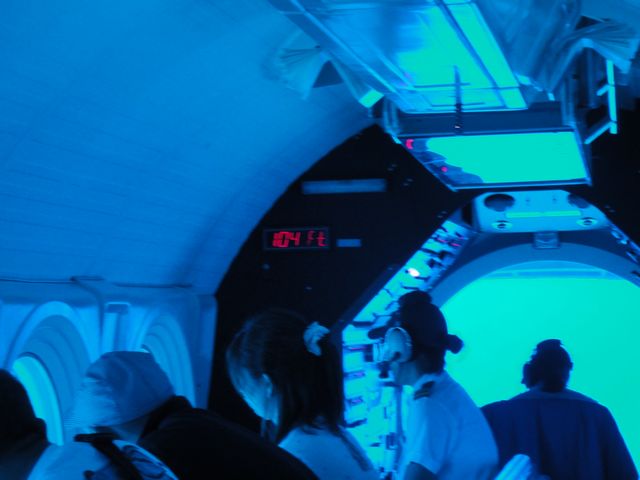 潜水艦は64人乗りの大きな潜水艦で中も結構広かったです。30Mぐらい潜って魚のいる所を案内してくれます。潜水艦からは色々な種類の魚を見ることができました。魚だけでなくウミガメも見ることができました。《とり》も《いぬ》も潜水艦に乗れたことと、魚が見えたことで大喜びでした。ちなみに解説は日本語でした。