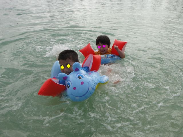 潜水艦に乗った後はショッピングセンターに移動して、お昼ご飯を食べていろいろお土産を買いました。その後ホテルに戻ってからラグーンに泳ぎに行きました。《たつ》は入るのをためらうぐらい水が冷たかったのですが、《とり》と《いぬ》は全く気にすることもなく、勢いよくラグーンに入って行きました。《とり》も《いぬ》も浮き輪を使って結構遠くまで勝手に泳いでいきます。二人で一緒に泳いでとっても楽しそうでした。