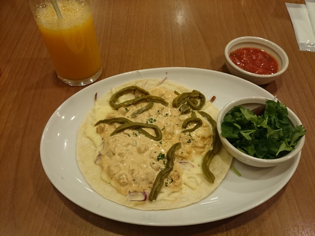 《とり》のピアノのレッスンの間、お茶をしながら待っていました。今日はチキントルティーヤです。辛くて美味しいです。