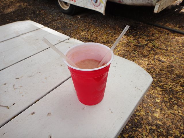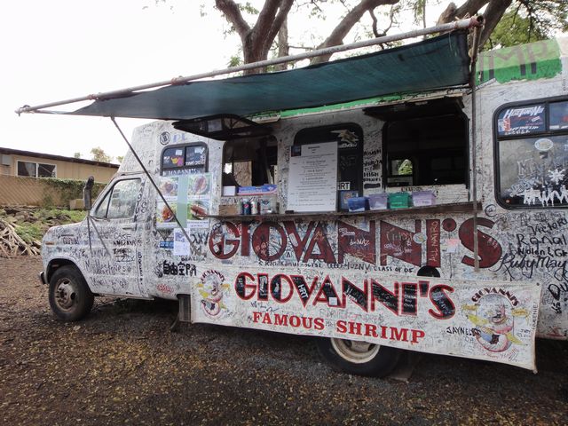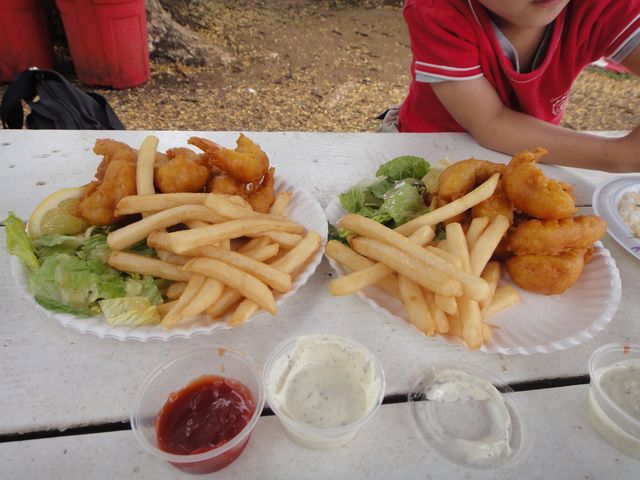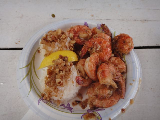 お昼ご飯はハレイワでシュリンププレートを食べました。ジョパンニというお店のガーリック・シュリンプとフィッシュ&チップスというお店のハーフ・シュリンプ・ハーフ・フィッシュです。ガーリック・シュリンプはガーリックだけのシンプルな味付けですが、濃厚なソースの味がごはんともエビとも合っていました。ハーフ・シュリンプ・ハーフ・フィッシュはフリッターになっています。日本ではあまり見かけないエビの食べ方ですが、オリジナルのタルタルソースとの相性が抜群でした。《とり》はガーリックライスがお気に入りで《いぬ》はエビのフリッターが気に入ったようでした。食後にはトロピカル・スムージーを飲みました。注文する時にうまく発音できなくてなかなか通じませんでしたが、甘くておいしかったです。