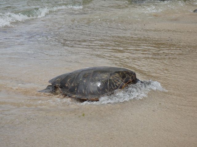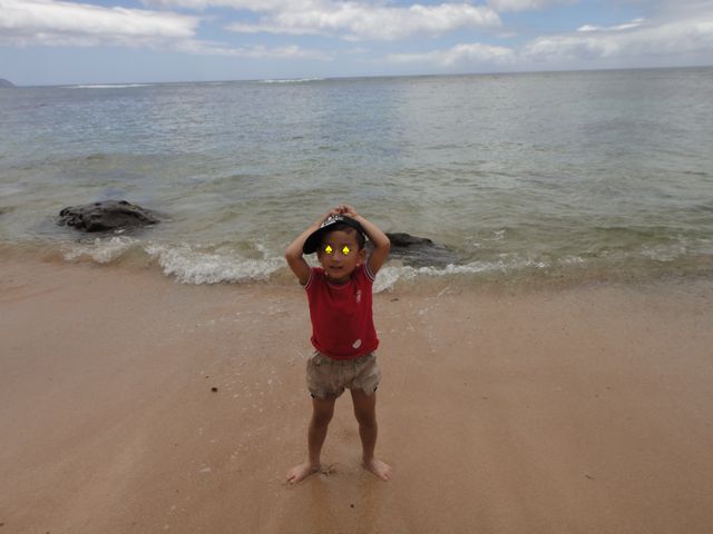 お昼ご飯を食べてからはウミガメが日光浴に来るラニアケアビーチに行きました。残念ながらウミガメが日光浴している姿は見れませんでしたが、2,3メートル先にいるウミガメと、たくさんのウミガメを見ることができました。ウミガメを見ていると、ウミガメが波に負けていて、横になったりひっくり返ったりしているのがおもしろかったです。、最初はウミガメを一緒に見ていた《とり》と《いぬ》は気づいたらウミガメに飽きて波と戯れるのに夢中になっていました。