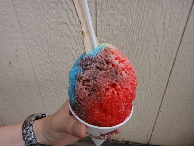 たっぷりウミガメを見てからもう一度ハレイワに戻ってマツモトシェイブアイスでかき氷を食べました。きめ細かなかき氷でとってもおいしかったです。《とり》も《いぬ》も小さなスプーンを使って必死に食べていました。