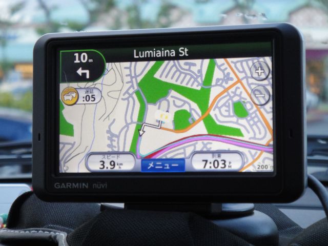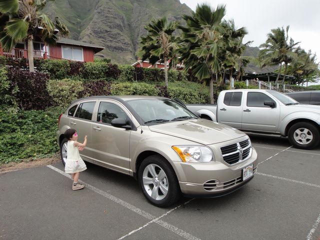 ハワイ旅行3日目に借りたレンタカーです。クライスラーのダッジ・キャリバーです。コンパクトサイズですが、日本の車と比べると大きいです。左ハンドルも初めてですが、右側通行も初めての経験です。たった1日なので、レンタカーを借りてから返すまで慣れませんでした。かなり意識していたのでウィンカーと間違えてワイパーを動かすことはありませんでしたが、右側通行なのにうっかり左側を走行しかけたことはありました。一緒に借りた日本語カーナビには有名観光地があらかじめ登録してあり結構便利でした。居場所も表示されるのですが、「道路」とか「交差点」とか表示されてました。。。