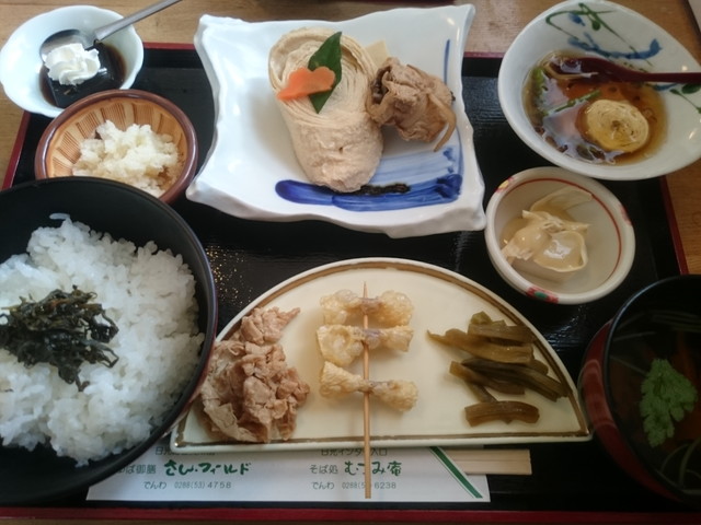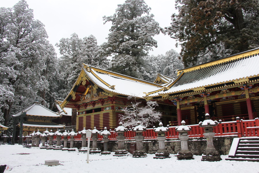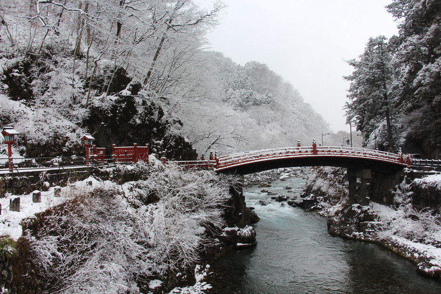 会社を休んで一人で日光に行ってきました。東武の快速で浅草駅から乗り換えなしで2時間ちょっとで日光に到着です。日光に着いたら雪は降っているし、山は雪景色でびっくりしました。東照宮まで歩いていく途中のお店でゆば御前をいただきました。どれもおいしかったです。ますは神橋を渡りました。雪が積もっていてとてもきれいです。