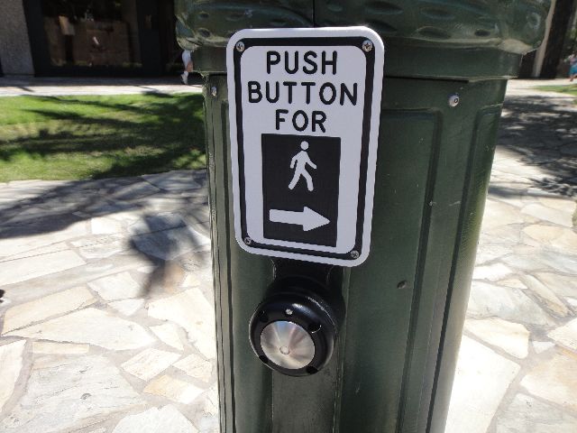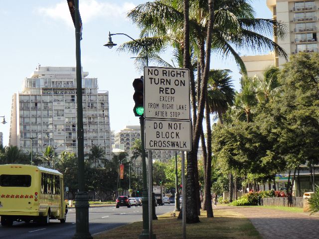 道路標識です。簡単な英語なので意味はわかりますが日本の標識の方がカラフルでわかりやすい気がします。ちなみに日本と違って基本的に赤信号でも右折可能なので、歩いているときは注意が必要です。
