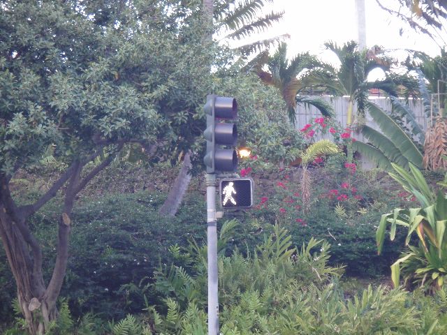 まずは歩行者用信号です。歩行者用のボタンがだいたい付いていました。昼間はこのボタンを押さなくても歩行者用信号も青になるようでした。青になってから、すぐに赤の点滅になってカウントダウンが始まります。だいたい横断歩道の3分の1ぐらい渡るともう赤の点滅になっていました。《とり》と《いぬ》を連れていると、青になってから渡り始めて渡りきった頃にはもう赤になっていました。