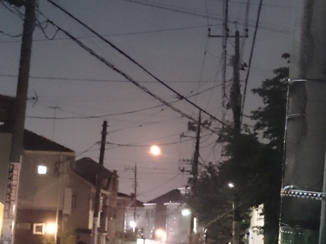 お月さまが低いところにあったので、大きく見えました。周りに建物があると目の錯覚で大きく見えるそうです。