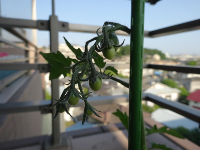 ベランダのプランターでプチトマトを育てています。実が大きくなってきました。