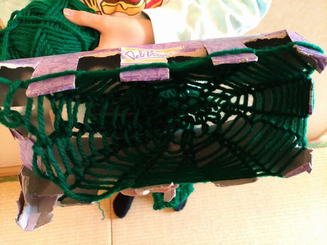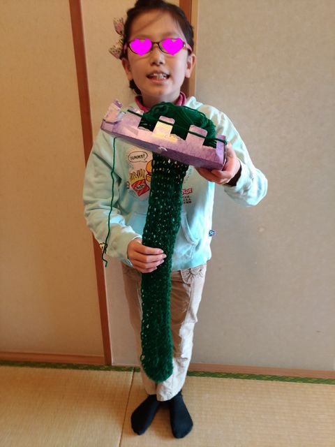 《いぬ》がマフラーをティッシュの空き箱を使って編んでいます。編みながらタブレットで映画をみていました。