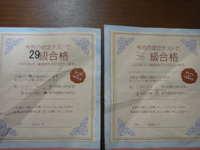 スイミングスクール 習い事 2010.06.24(木) 《とり》と《いぬ》がスイミングスクールの進級テストにやっと合格しました。《とり》はけのび5m(ヘルパーなし)に合格して、次からは背面キック5m(ヘルパー付)の練習です。 《いぬ》は顔付け5秒に合格したので、次からは目を開けたまま7秒もぐる練習です。