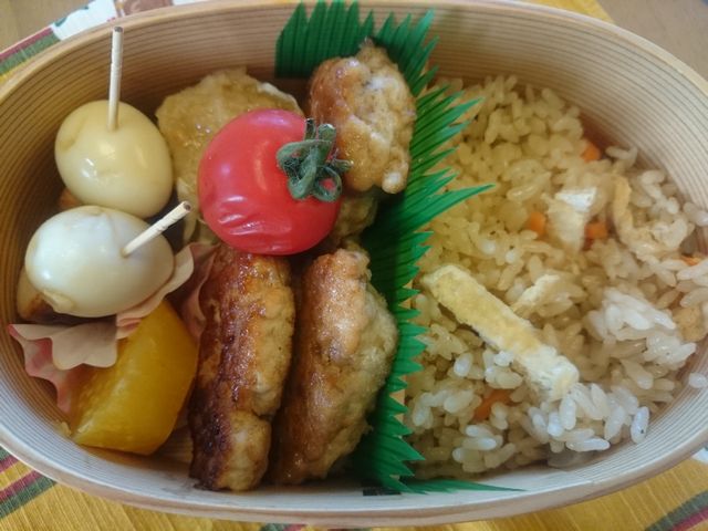 《とり》は市の体育大会があったので、弁当持参です。《とり》の希望で炊き込みご飯にしました。