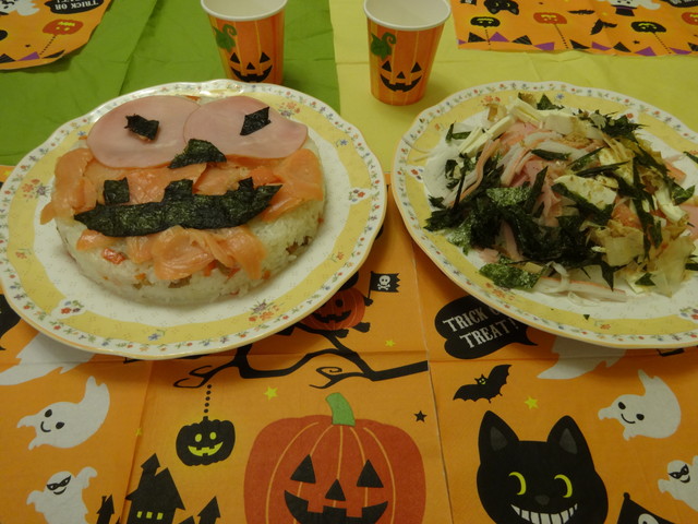 《いぬ》がちらし寿司をハロウィンっぽくしてくれました。夜はハロウィンパーティーに持っていくスティックチーズケーキを作りました。