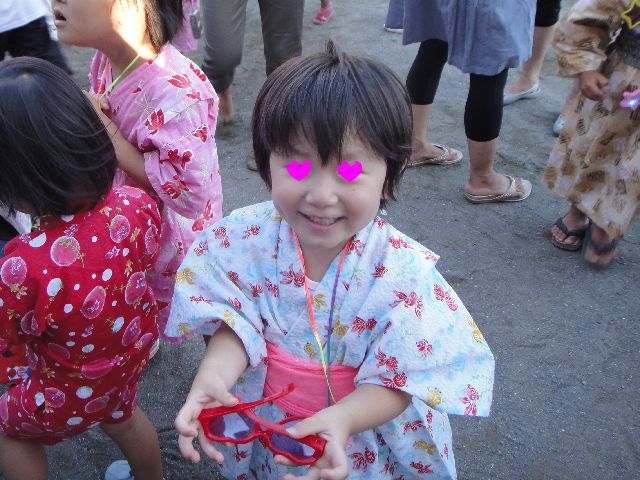 夕方から年長さんの納涼大会がありました。《とり》も《いぬ》も幼稚園で作ってきたうちわを持って参加です。《いぬ》は《とり》のお友達にお願いして一緒に踊ってもらいました。一通り踊ってジュースやおもちゃをもらい花火をして解散となりました。
