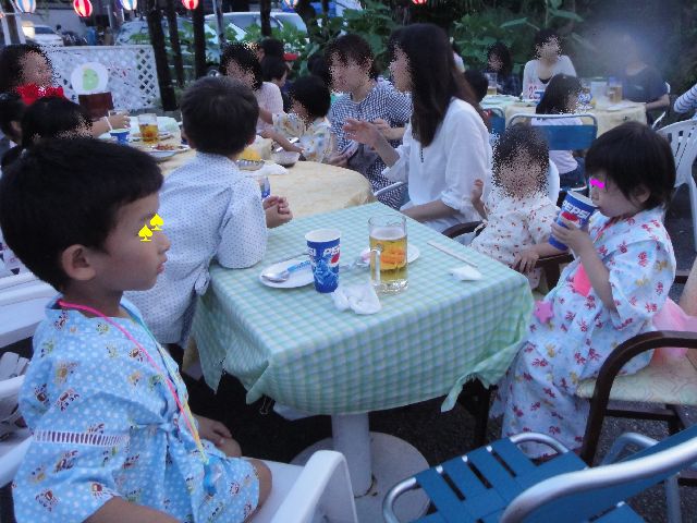 幼稚園のママ友からのお誘いで《へび》と《とり》と《いぬ》は納涼大会が終わってから近くのビアガーデンに行っていました。オープン初日ということもあり、テレビに出ている手品師や吉本の芸人やサックスの生演奏などの余興があり、《とり》と《いぬ》は楽しそうでした。ちなみに子供たちがステージの前を陣取っていました。ビアガーデンとはいえ子連れのグループが多かったそうです。