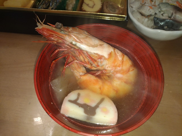 お正月 食べ物 2017.01.01(日) あけましておめでとうございます。7時前に家族みんなで近所の神社にお参りに行ってから、おせち料理を食べました。お雑煮には大きなエビが入っています。近所の高台からは富士山がきれいに見えていました。