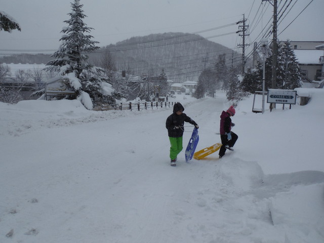 車山高原の2日目です。起きて着替えてから、《とり》も《いぬ》もペンションでソリを借りて遊んでいました。車は一晩で結構雪が積もっていました。