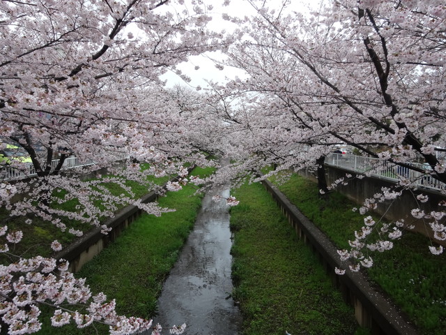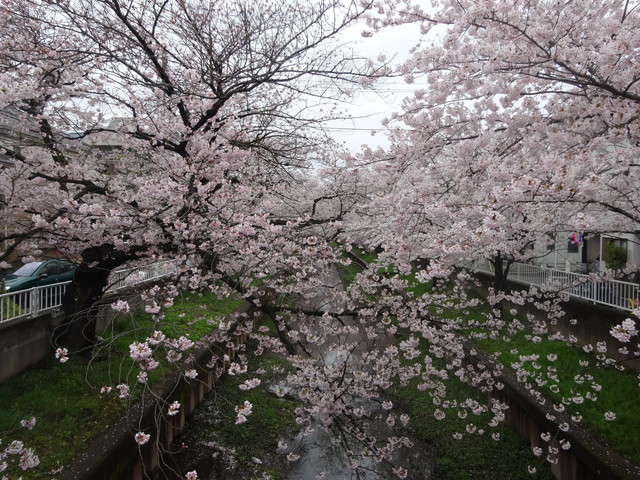 朝から雨でしたが、夕方になって雨が止んだので近所の桜並木を見に行ってきました。ちょうど満開で見ごろになっていました。
