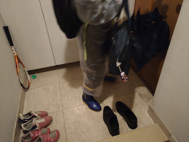朝から大雨で強風だったので、《とり》はレインコートと長靴で登校しました。体育の授業もあるので、運動靴も持って行きました。