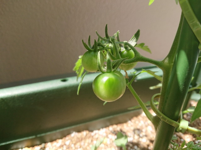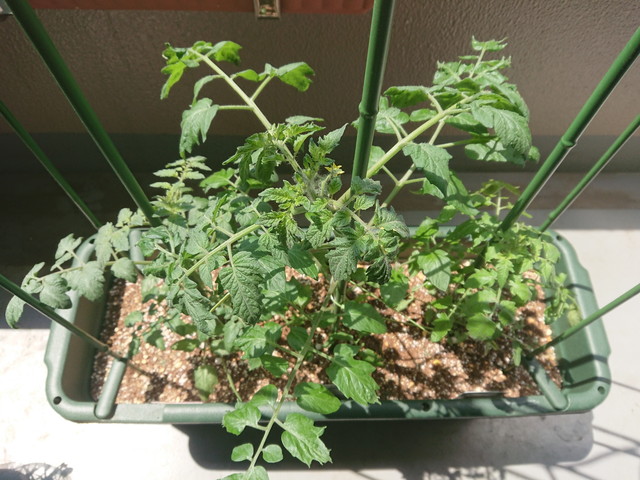 ベランダのプランターでミニトマトを育てています。すでに実がついているものもあります。ミニトマトが出来るのが楽しみです。