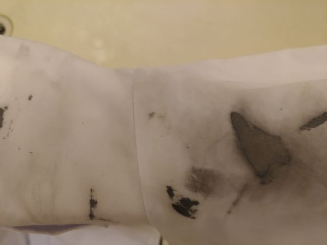 《とり》が書道で派手に墨をつけてきました。学校指定の良い墨を使っているので落ちません。小学校の頃は洗濯で落ちる墨汁を使っていたので大丈夫だったのに。。。