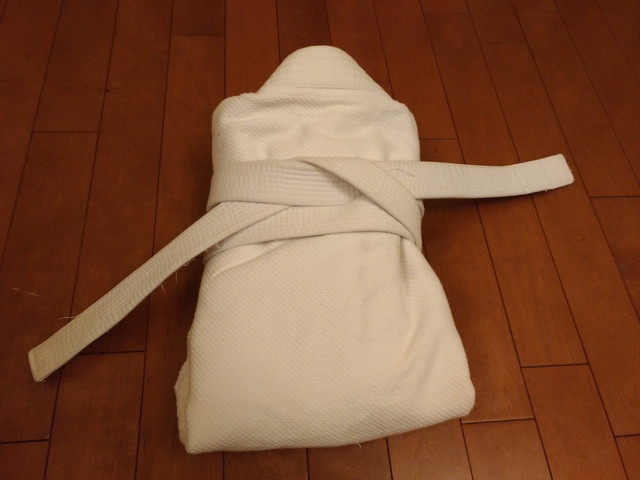 《とり》が柔道着をたたむ練習をしていました。きれいにたたんでいることをチェックされるそうです。