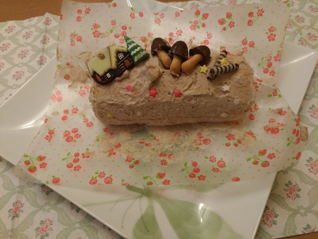 クリスマスなので、《いぬ》がお菓子教室でブッシュドノエルを作ってきてくれました。みんなでおいしくいただきました。