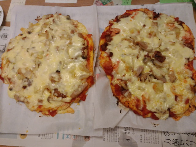 夜ご飯はピザです。《とり》と《いぬ》が1枚ずつ作ってくれました。