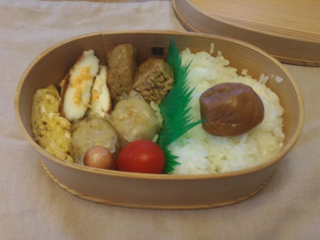 ランチミーティングのお弁当です。今日が曲げわっぱのお弁当箱を《たつ》が使いました。