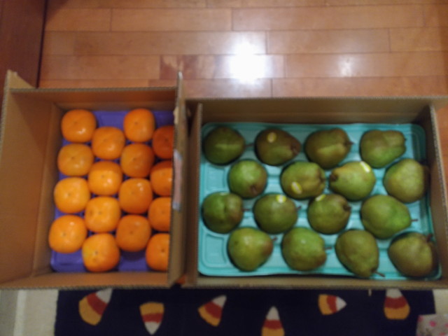 ふるさと納税のお礼の柿とラフランスが届きました。まだ熟れていないので、しばらくしてから食べようと思います。