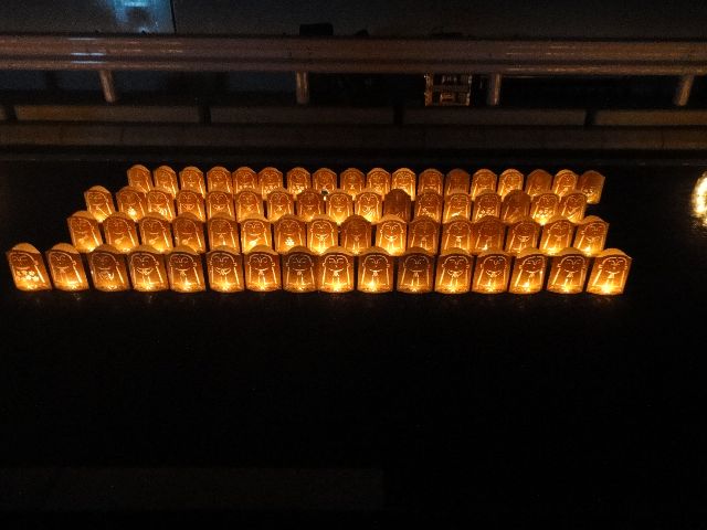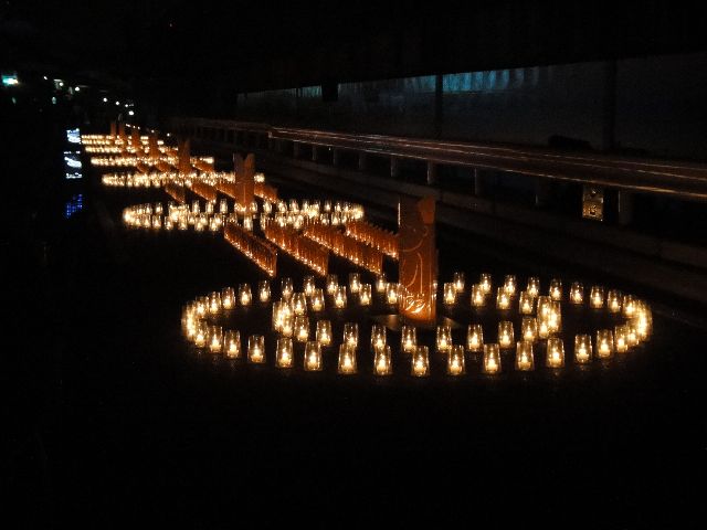 大師トンネルを歩きます。トンネルの中にはお地蔵様を模したキャンドルがあり、幻想的な空間を演出してありました。よく見ると一体一体表情が異なります。イベントのコースの途中で非常口を通りました。生まれて初めての高速道路の非常口です。通った所は地下6階でした。がんばってスタンプラリーのスタンプ5個を集めて、パトロールカーのティッシュ入れをもらいました。《とり》は家に帰ったらすぐに作って遊んでいました。結構歩きましたが、楽しいイベントでした。