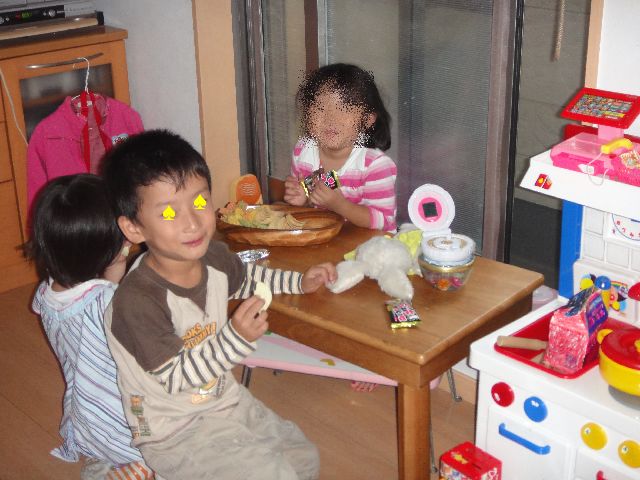 家遊び お友達 2010.10.06(水) 《いぬ》のクラスのお友達の家に遊びに行ってきました。《とり》のお友達と遊ぶことが多いので、《へび》にとってはとても新鮮なことだったそうです。小学3年生のお姉ちゃんが帰宅してからおやつを食べて、みんなで仲良く遊び、最後は家の前でキックボードなどをさせてもらいました。《いぬ》のお友達が《とり》のことをとても慕っていて《とり》も意外と相手をしてあげていました。とても楽しく過ごせました。