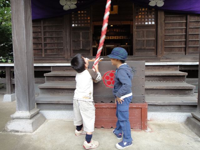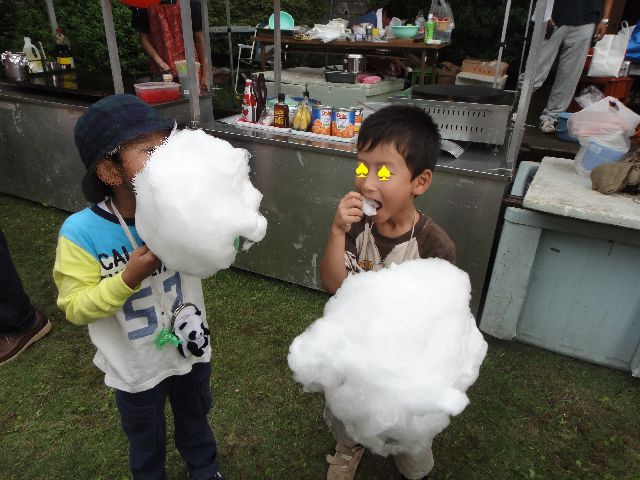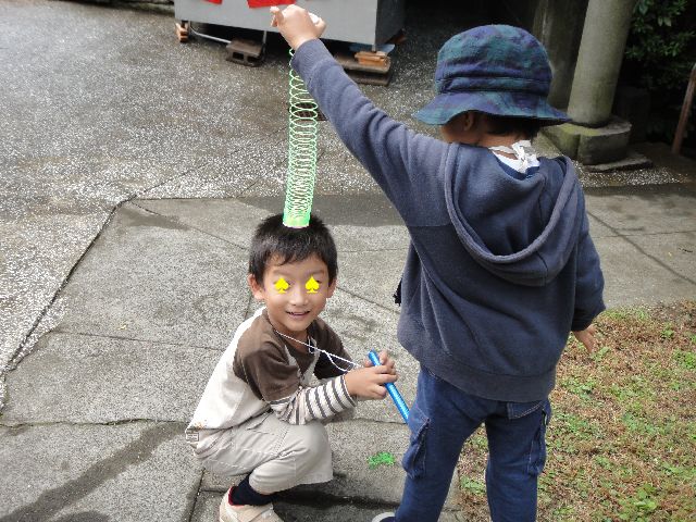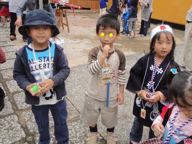 お祭り お友達 2010.10.10(日) 近所の神社のお祭りに《とり》と《へび》がお友達と行ってきました。《たつ》と《いぬ》はお家でお昼寝です。おみこしやししまいを見たり、自分の顔より大きいわたあめを食べたりしました。この日は500円持たせて自分でその中でやりくりさせましたが、スライムやベーゴマを買ってあっという間に使い切ってしまいました。自分でお金を使うのは初めてですが、10円や20円で買えるお菓子を買ったりして、きっちり使っていました。お友達とはベーゴマやスライムで盛り上がっていました。