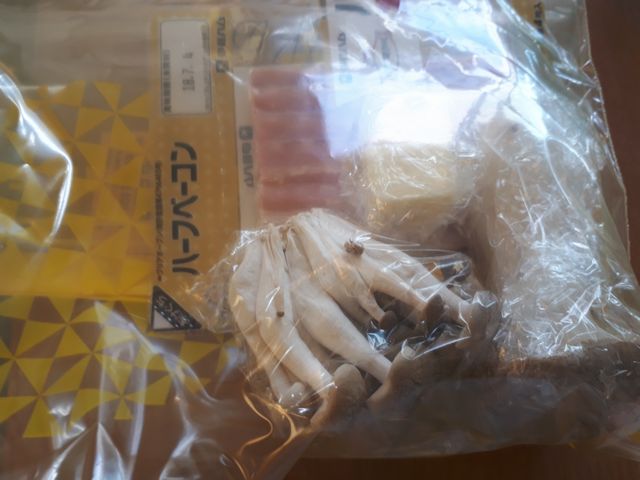 《いぬ》が調理実習をするので材料を持って行きました。ベーコンときのこのバター醤油炒めだそうです。