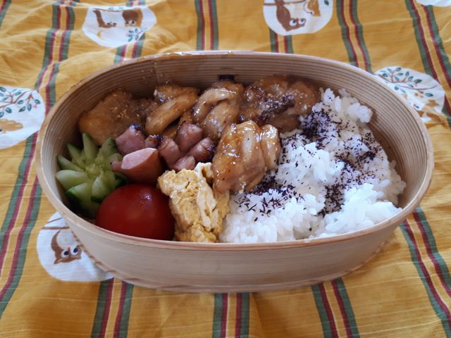 今日のランチミーティングのお弁当です。最初は唐揚げの予定でしたが中学の委員の仕事が忙しくて準備が間に合わず照り焼きになりました。