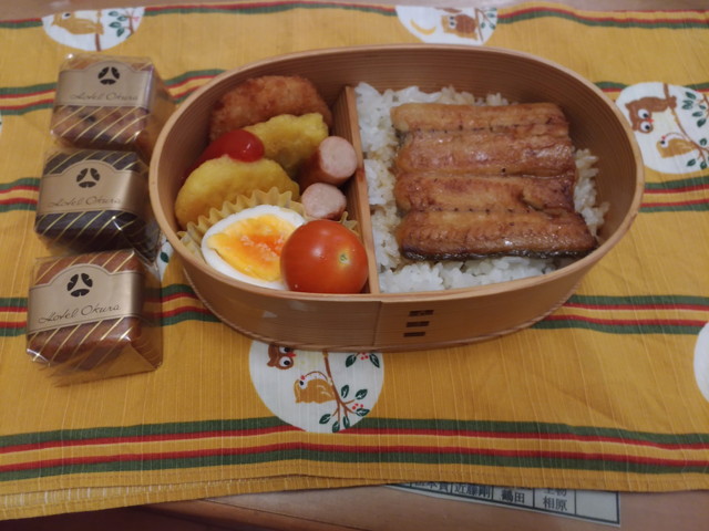 《とり》のお弁当とおやつです。ウナギ弁当で、うらやましいです。
