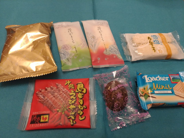 会社でお土産をいただきました。宮古島、沖縄、タイなど、いろんなお土産です。