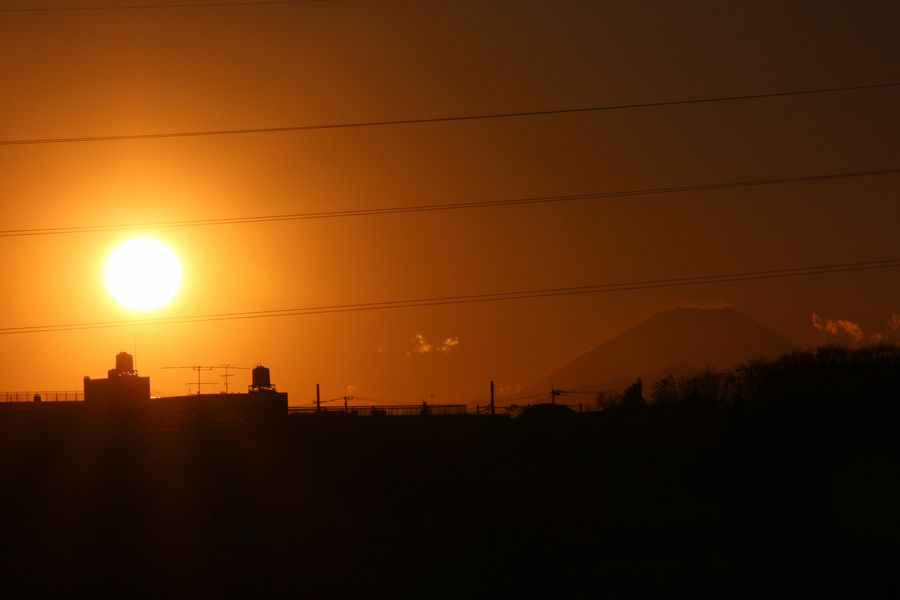 夕日がきれいだったので、近所の丘に登って夕日と富士山を撮りました。電線が無ければいいのになぁって思います。