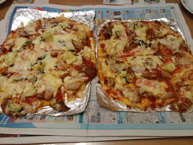 夜ご飯はピザです。《とり》と《いぬ》が1枚ずつ作ってくれました。