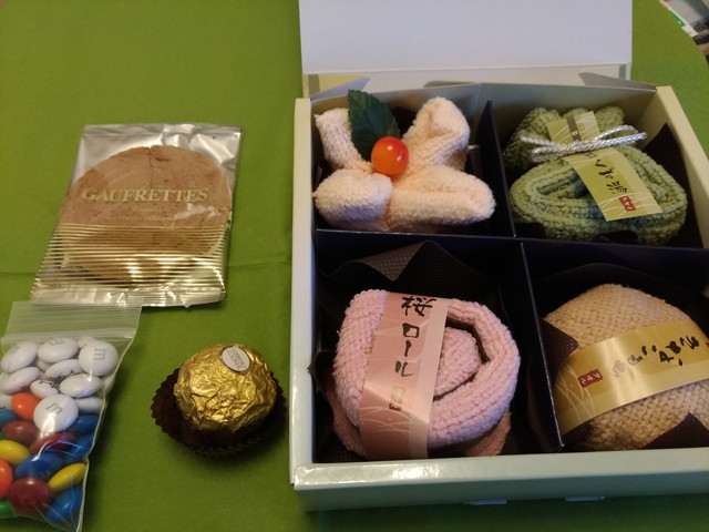 会社でアメリカのお土産と異動の送別の品で和菓子のタオルをいただきました。