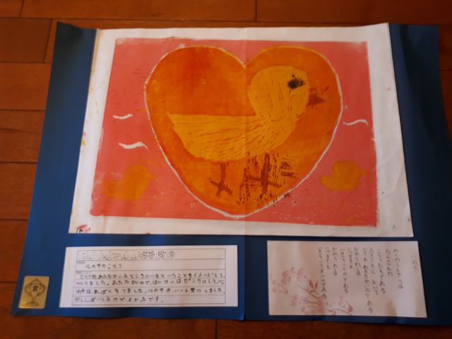 作品 中学校 2018.03.18(日) 《とり》の美術の作品を飾ってみました。芸大の先生が教えて下さるのでうまく出来てます。《いぬ》の作品は左下に賞というシールが貼ってあったので、すごいねって褒めたら、全員シールを貼ってもらえるって言われました。。。
