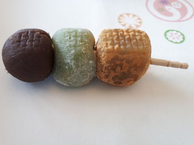 《とり》のお土産のお団子です。お皿に載せて煎茶と共にいただきました。