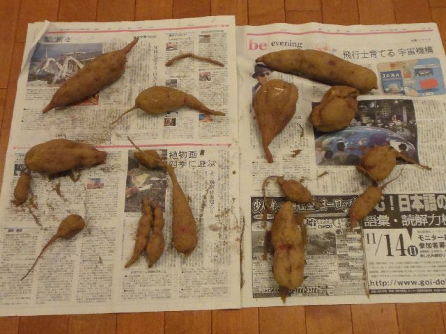 《とり》がいも掘りに行ってきました。帰ってきたら自分で新聞を広げていもを出していました。長靴で行かせましたが、泥だらけになって帰ってきました。