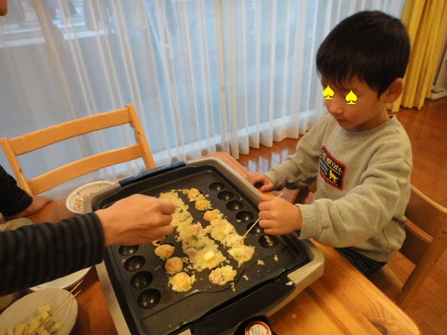 たこ焼き 子育て 2010.10.31(日) 引越してから初めてたこ焼きをしました。《とり》と《いぬ》が手伝ってくれました。《いぬ》はまだたこ焼きを回せないので、材料を入れる所だけのお手伝いです。おいしくできあがりました。 朝は昨日買ったエサのようなバナナでバナナマフィンを《へび》が作ってくれました。