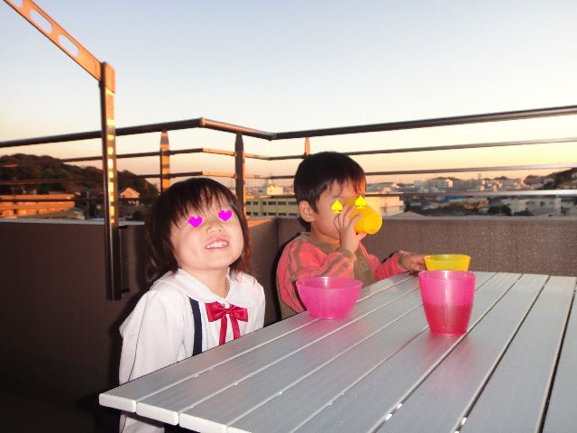 ベランダ 子育て 2010.11.05(金) 今日は気分を変えてベランダでおやつタイムにしてみました。バーベキュー用のテーブルとイスをベランダに出したら《とり》も《いぬ》も大喜びでした。たまにはこういうのもいいかなぁと思いました。