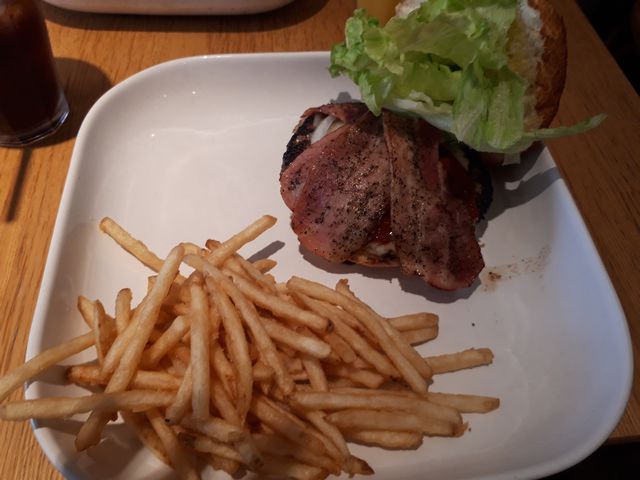 《いぬ》とでかけていたので帰りにハンバーガーを食べました。注文をしてから出来上がりまで40分かかりました。美味しいですが《いぬ》には少し黒コショウが辛かったようです。帰りに伊勢丹でケーキを買いました。