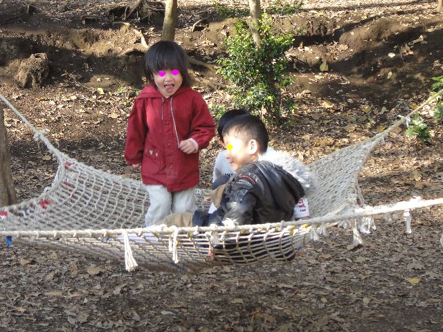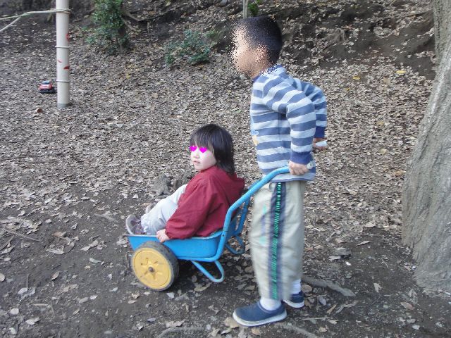 公園遊び お友達 2010.11.24(水) 午前保育の日なので、幼稚園が終わってから近くの公園で遊びました。今日は男の子5人と女の子は《いぬ》だけでしたが、みんな意外と《いぬ》の面倒を見てくれていました。一緒にハンモックに乗ったり、台車に乗せてくれたりして、みんな楽しそうでした。最近は日が暮れるのが早いので、4時頃に解散になりました。