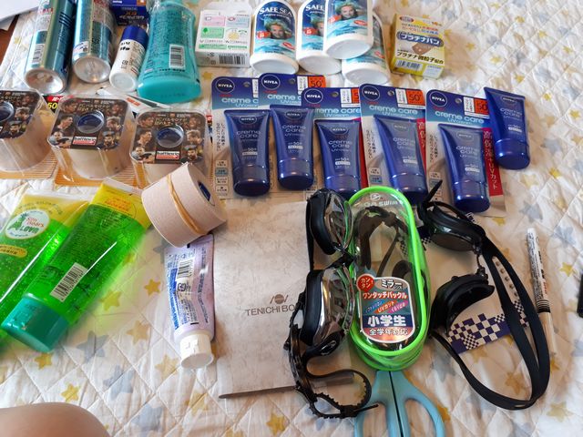 合宿準備 お買い物 2018.07.27(金) 合宿に向けて《とり》が、ゴーグルがくもると言うので新しいのを買いました。お菓子は無難な量にしました。シリアルや氷砂糖、塩分入りのタブレットもおすすめらしいですが食べたことがないのでやめておきました。今回は日焼け止めやテーピングにお金がかかりました。