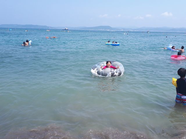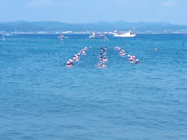 見学 中学校 2018.08.05(日) 《とり》の合宿の見学ができる日だったので行ってきました。みんなで泳ぐので到着地点で遊びながら待っていました。 《とり》たちが到着し、お昼を食べて休憩をしてからまた戻って行きました。 先に合宿所に戻って休憩をしながら待っていました。部屋の窓がとても大きくて景色がとてもきれいです。エアコンがないので心配でしたが、風通しがよく涼しかったです。 帰りはお寿司を食べて帰りました。